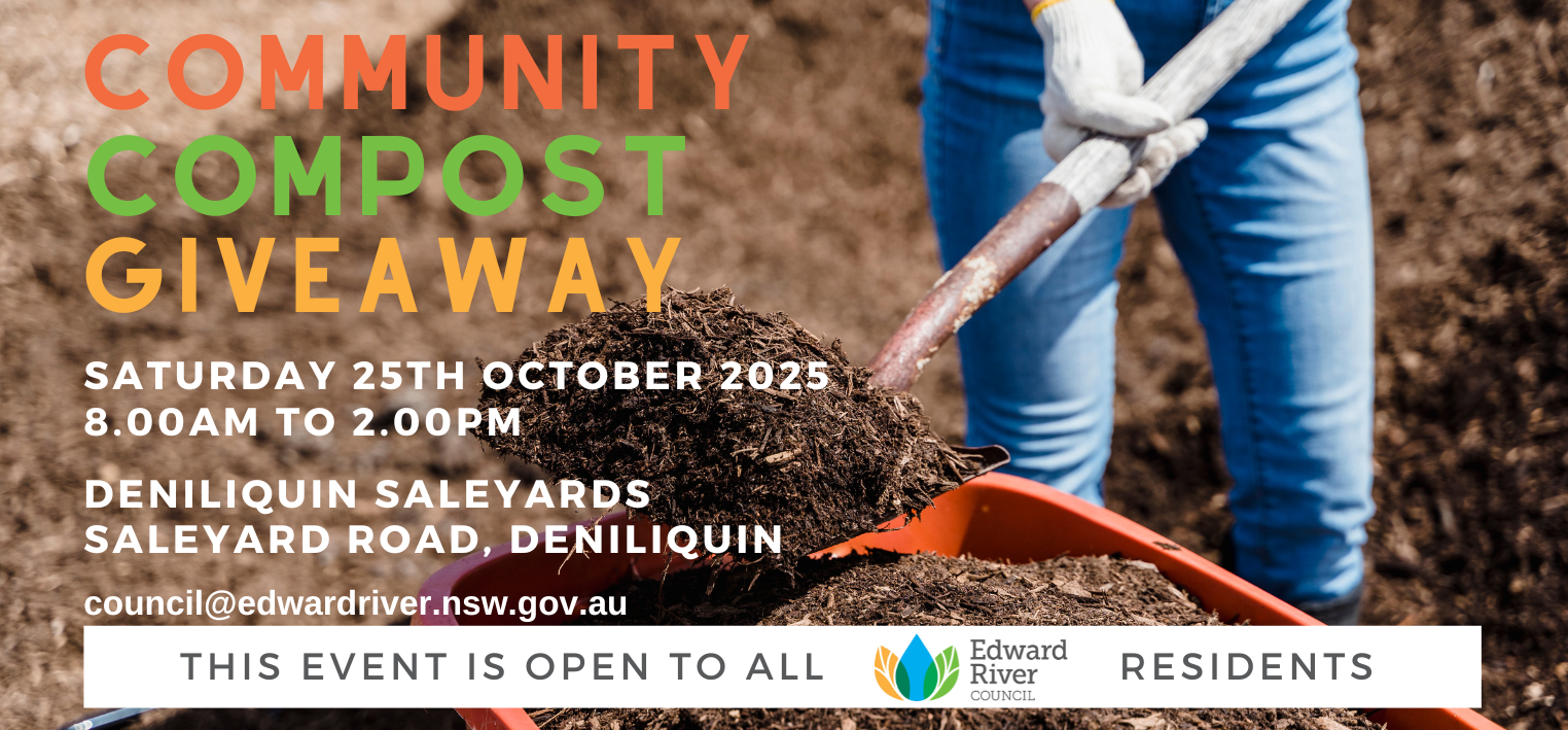 Share Compost Giveaway Day - Saturday 25 October 2025 on Facebook Share Compost Giveaway Day - Saturday 25 October 2025 on Twitter Share Compost Giveaway Day - Saturday 25 October 2025 on Linkedin Email Compost Giveaway Day - Saturday 25 October 2025 linkEdward River Council are giving back to the Community as a thank you for accomplishing such low contamination rates in our green bins.