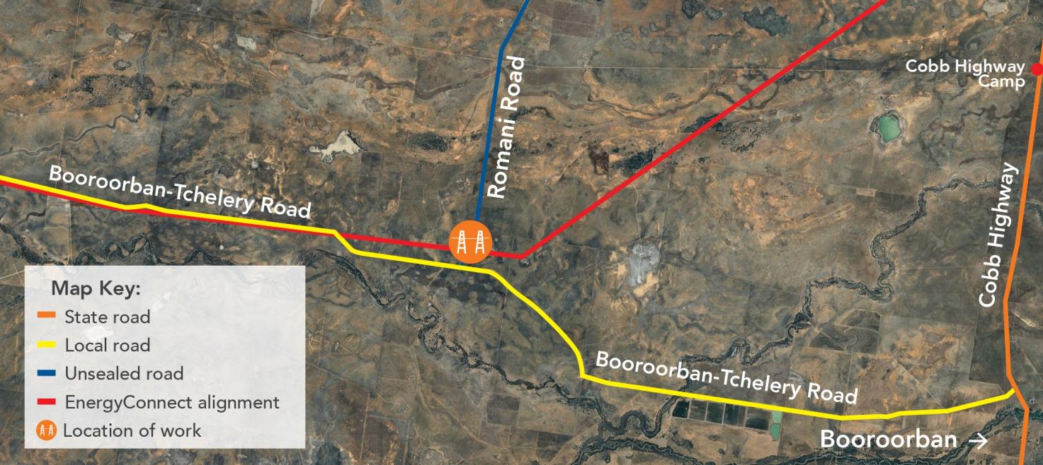 Share Transmission Line Stringing - Romani Road on Facebook Share Transmission Line Stringing - Romani Road on Twitter Share Transmission Line Stringing - Romani Road on Linkedin Email Transmission Line Stringing - Romani Road linkThe EnergyConnect project team are continuing to advance construction activities on the transmission line from Buronga, NSW to Dinawan, near Bundure. From Saturday 25 October to Tuesday 18 November 2025, weather permitting, our project delivery partner Downer Group, has scheduled works for stringing transmission lines across Romani Road, approximately 18 km west of Booroorban, in the Edward River Local Government Area